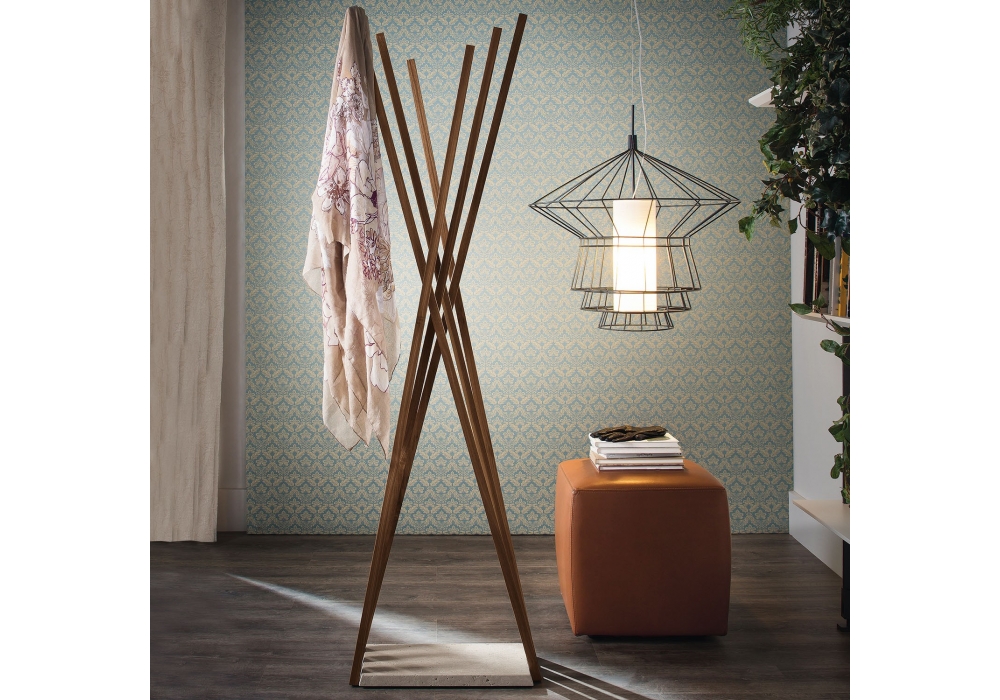 Oscar, von Angelo Tomaiuolo für Cattelan Italia entworfen, ist eine Kleiderhaken aus Holz verfügbar in Nussbaum Canaletto oder gebrannter Eiche. Basis aus natürlichem Travertin.