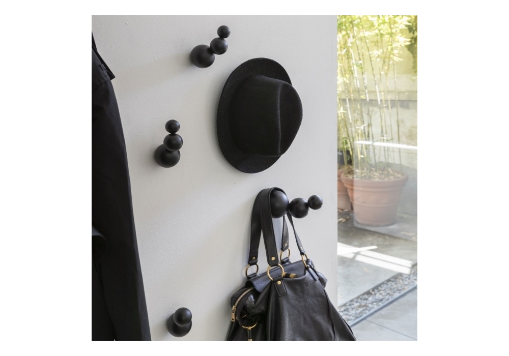Bubble von Annebeth Philips für Mogg entworfen, ist ein Set mit 5 Wandgarderoben aus gedrechseltem Buchenholz in 5 verschiedenen Größen. Verfügbar in Naturholz oder mattschwarz lackiert. Der Endteil der beiden 3-Kugel-Elemente ist verstellbar.