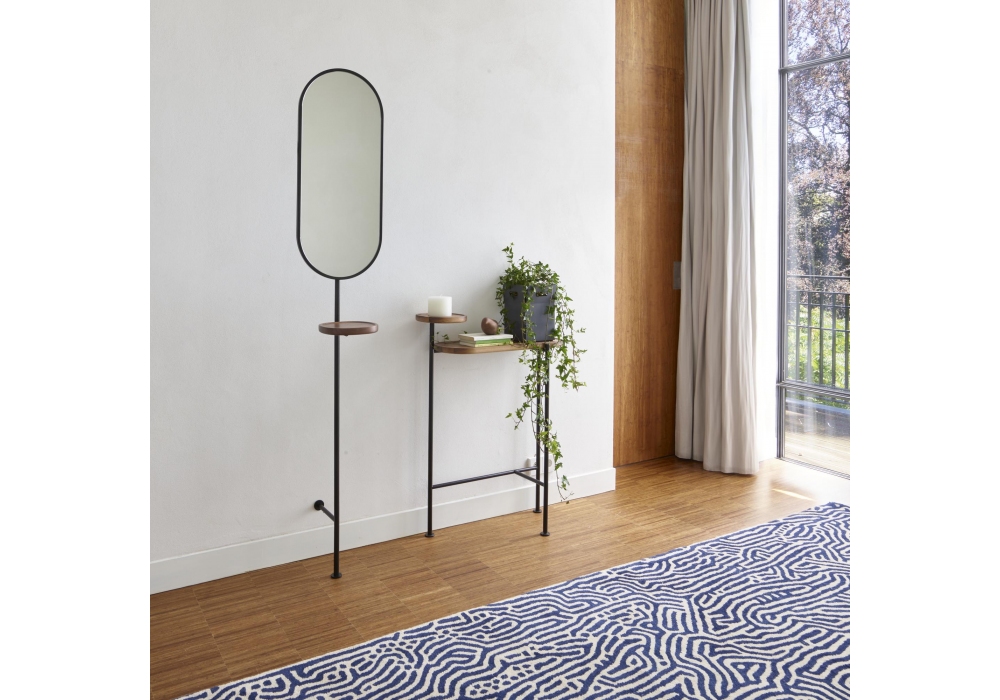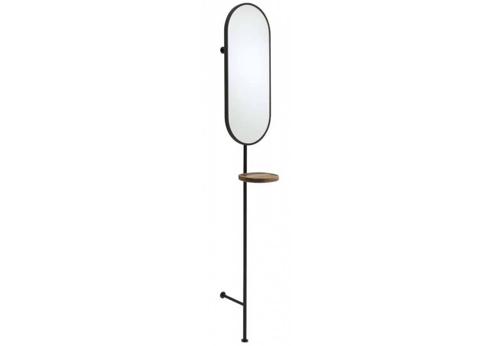 Loomy von Roberto Paoli für Ligne Roset entworfen, ist ein Stummer Diener mit Struktur aus mattschwarzem Stahlrohr Ø 2 cm; Ablage (20 x 20 x 2,5 cm) aus amerikanischem Nussbaum natur seidenmatt lackiert. Spiegel H 76 B 32, Stärke 2,5 cm. Dieser Artikel ist mit verstellbaren Buchsen ausgestattet und muss an einer Wand befestigt werden. Die Spiegelrückseite ist mit einer Kleiderstange ausgestattet.