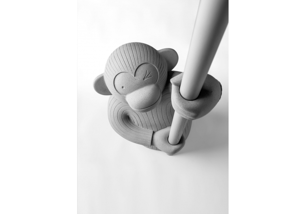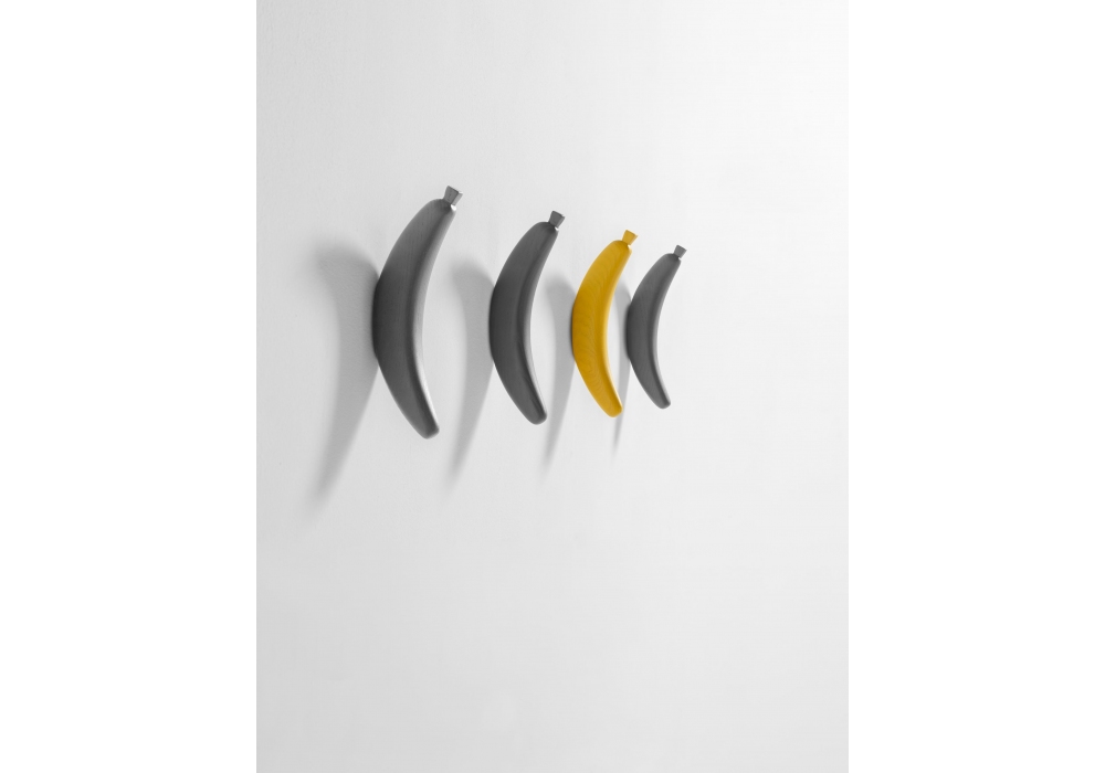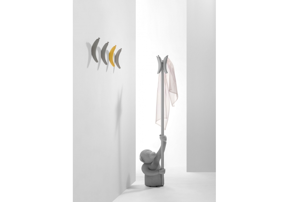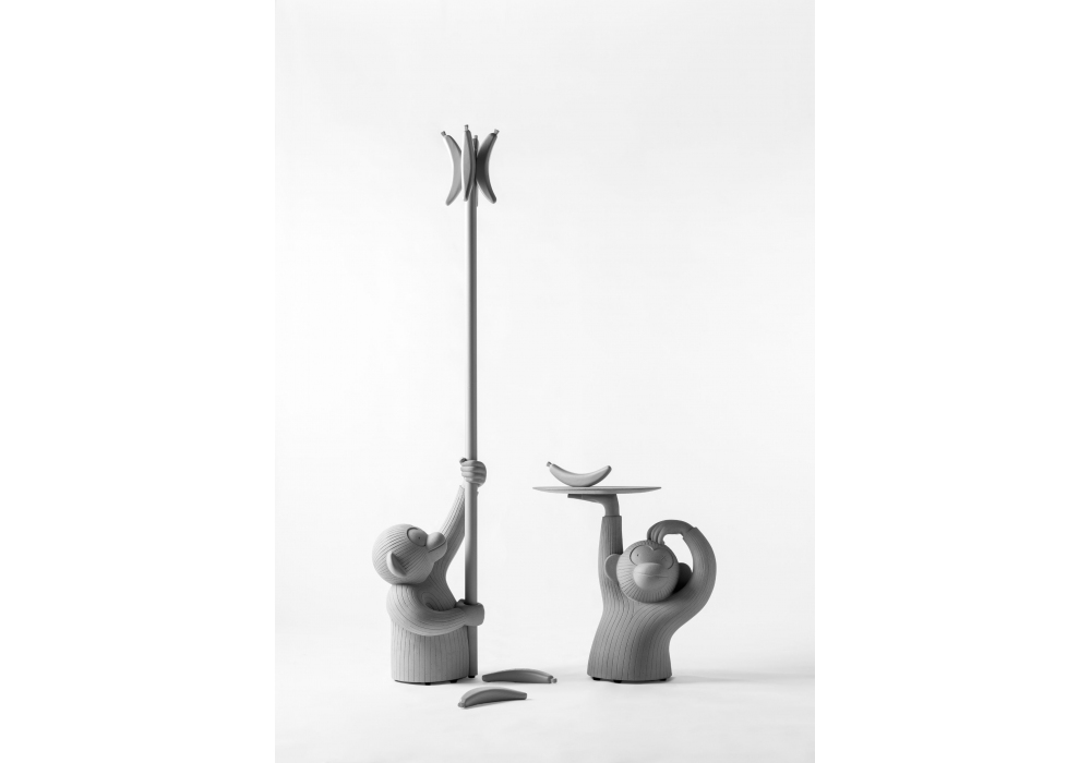 Monkey von Jaime Hayon für BD Barcelona entworfen, ist ein Kleiderbügel mit Betonsockel, Stange und Banane aus massiver Esche, erhältlich in Schwarz oder Grau.