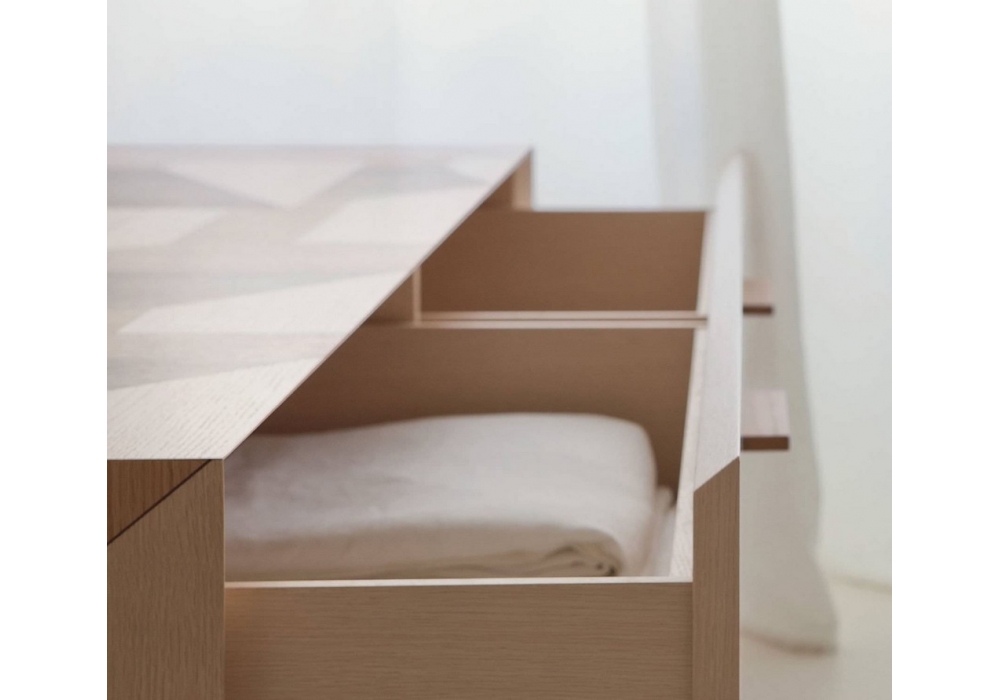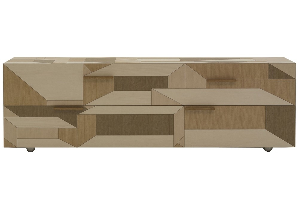 Inlay is a chest of drawers designed by Front for Porro. Inlay entirely recovers the inlay technique, an ancient and precious old time tradition. A chest of drawers with 2 drawers, covered with a decoration recalling parallelepipeds crossed in space, leading to a unique 3 D effect. Inlay is the result of an accurate processing technique, with 4 different oak colours and a black profile: a contour line separating the different faces of the texture while defining the design. The chest of drawers exhibits 2 drawers, fitted with 2 internal trays and a single front. The Inlay handles are in solid oak; the interior is in natural oak.