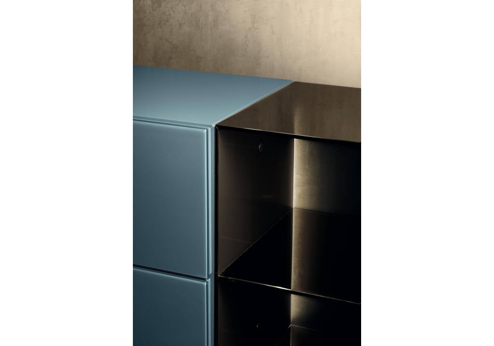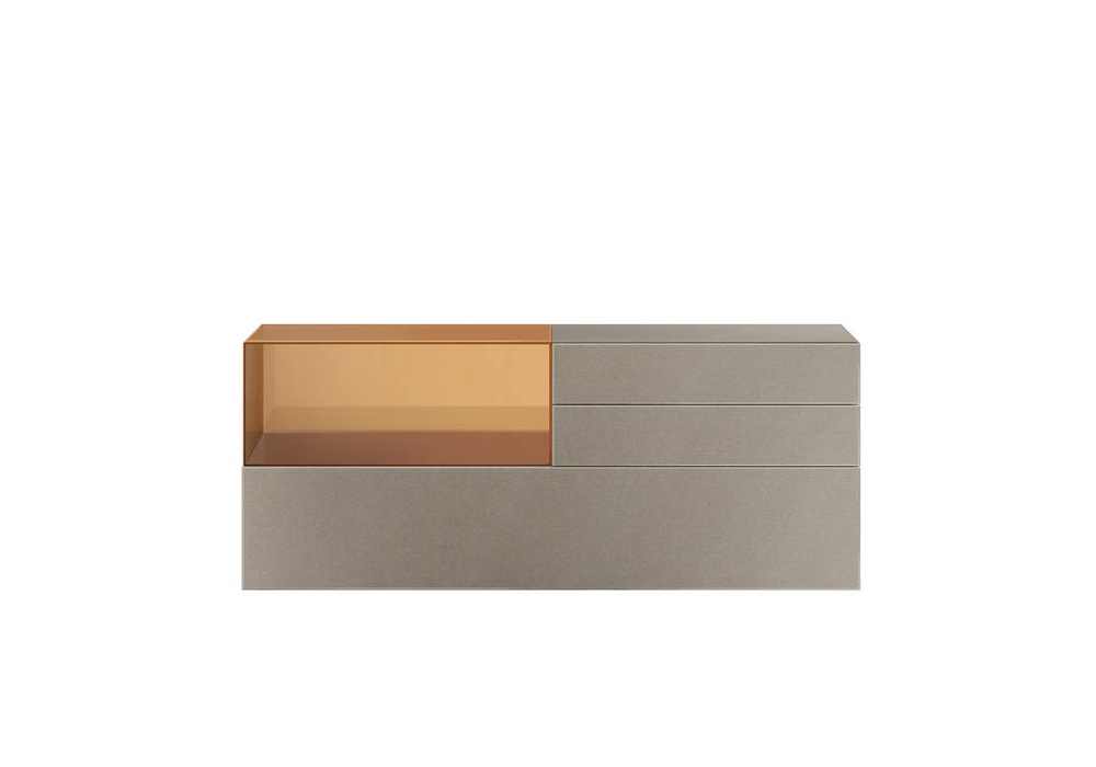 36e8 von Daniele Lago entworfen, ist eine Kommode, die in verschiedenen Modellen erhältlich ist. Unter den verwendeten Materialien sind: Wildholz, lackiertes Holz, Glas und Glas. Erhältlich mit Beinen aus gehärtetem Glas, mit Füßen oder an der Wand befestigt.