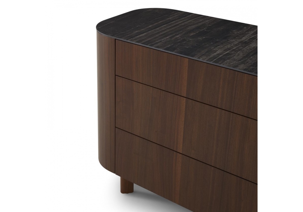 Parabole von Marie Christine Domer für Ligne Roset entworfen, ist eine Kommode mit 3 großen Schubladen mit Struktur aus dunkler Nussbaum, kombiniert mit der Keramiksteinplatte mit Marmoreffekt, verfügbar in 2 Ausführungen. Sein extrem abgerundetes Volumen verleiht ihm eine ruhige Fülle, einen wunderbaren Charakter aus alter Zeit.