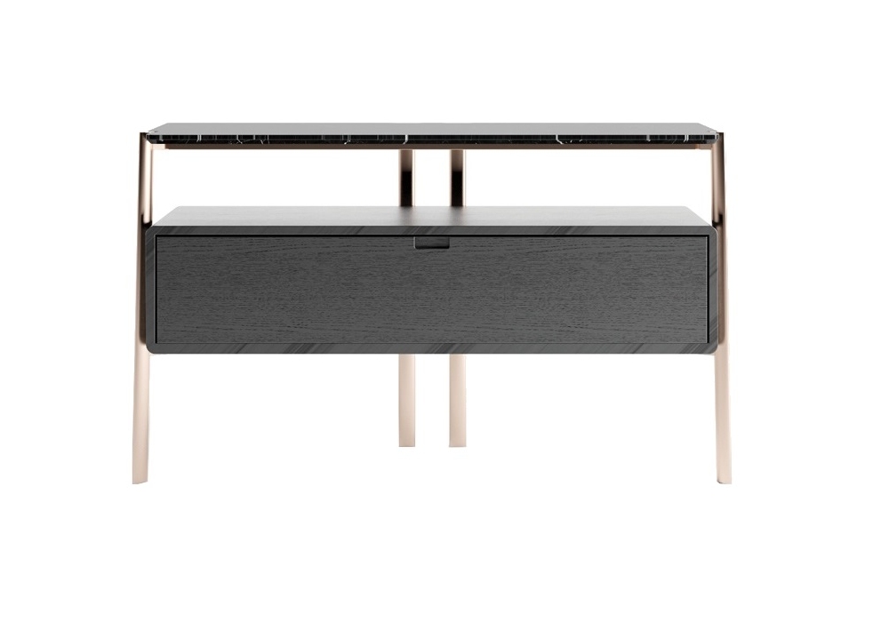 Eros von Studio 63 für MisuraEmme entworfen, ist eine Kommode mit bronzefarben lackierter Metallstruktur, Behälter aus schwarzer Eiche und Marmorplatte.