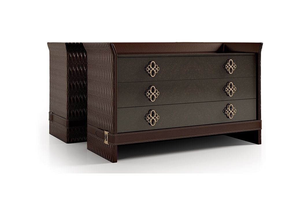 Numero Tre von Roberto Serio für Turri entworfen, ist eine Kommode mit Struktur aus MDF, Massivholz, Sperrholz und Spanplatten in glänzender Ausführung und Platte aus Holz oder Marmor. Griffe aus vergoldetem Metall oder mit Lederapplikationen. Es ist in der Version mit der Rückseite aus besticktem Leder oder aus glattem mattem Leder verfügbar.