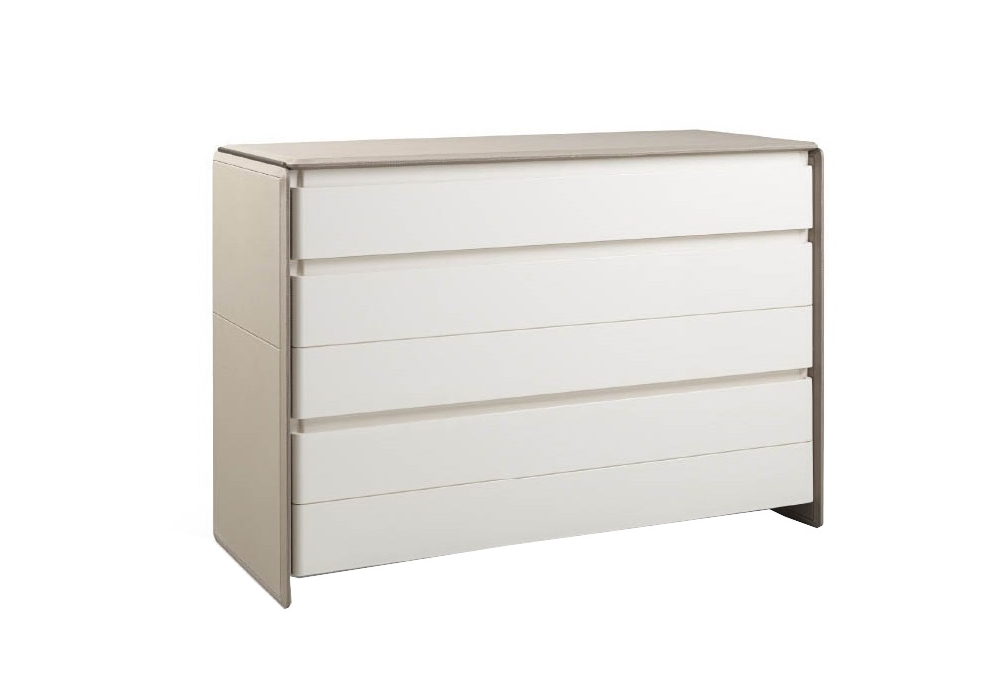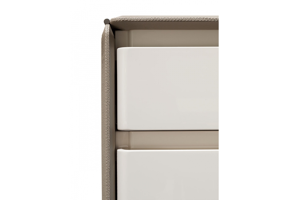 Zero von Andrea Bonini für Turri entworfen, ist eine Kommode mit Struktur aus MDF und Sperrholz mit Lederbezug. Holzfronten in glänzend lackierter Ausführung. Metallteile in mattem Finish.