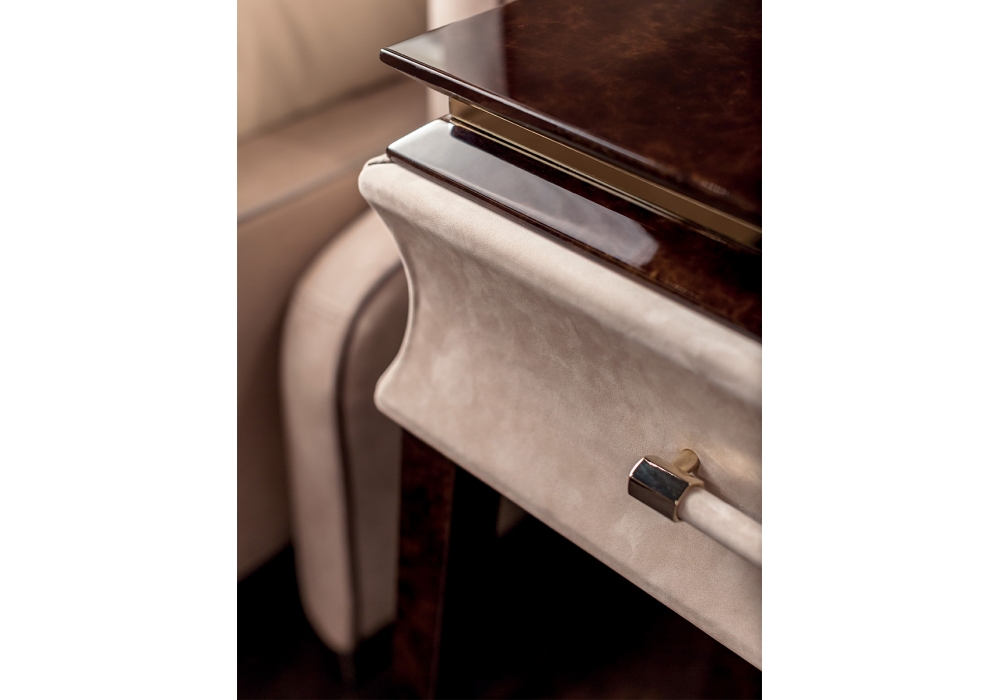Noir, von Andrea Bonini für Turri entworfen, ist ein Nachttisch mit Struktur aus MDF und Spanplatten in glänzend lackierter Ausführung, Lederbezug und Platte aus Marmor oder Holz. Es gibt eine Schublade mit Innenfutter aus Mikrofaser. Füße und Metallteile in verschiedenen Ausführungen.