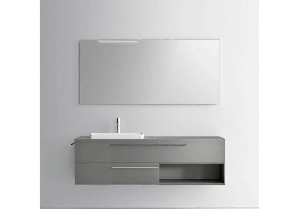 One 19.02 von CR Noorth für Noorth entworfen, ist ein Badezimmersystem mit eingebautem Waschbecken, mattem lackiertem Sockel, verchromtem Griff, verchromtem Handtuchhalter, satiniertem Edelstahlhahn und Spiegel mit LED-Lampe.