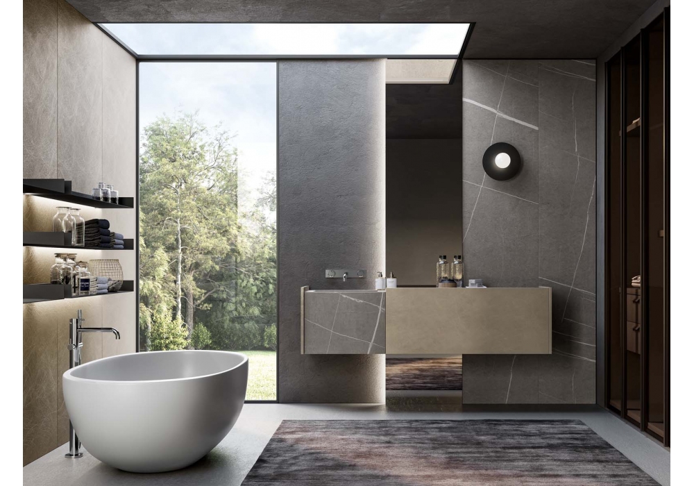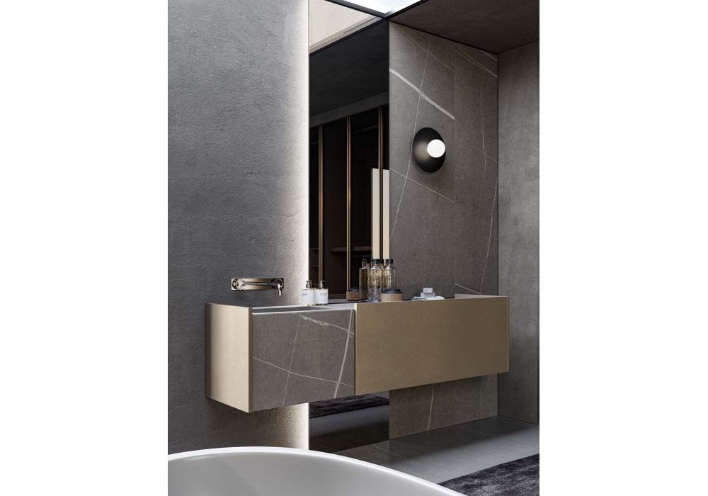 Major von Willy Dalto für Birex entworfen, ist ein Badezimmersystem aus lackiertem metallischem Nickel, geformte Schublade mit Front aus grauem Senda-Steinzeug. Platte aus grauem Senda-Steinzeug und integrierte Badewanne.