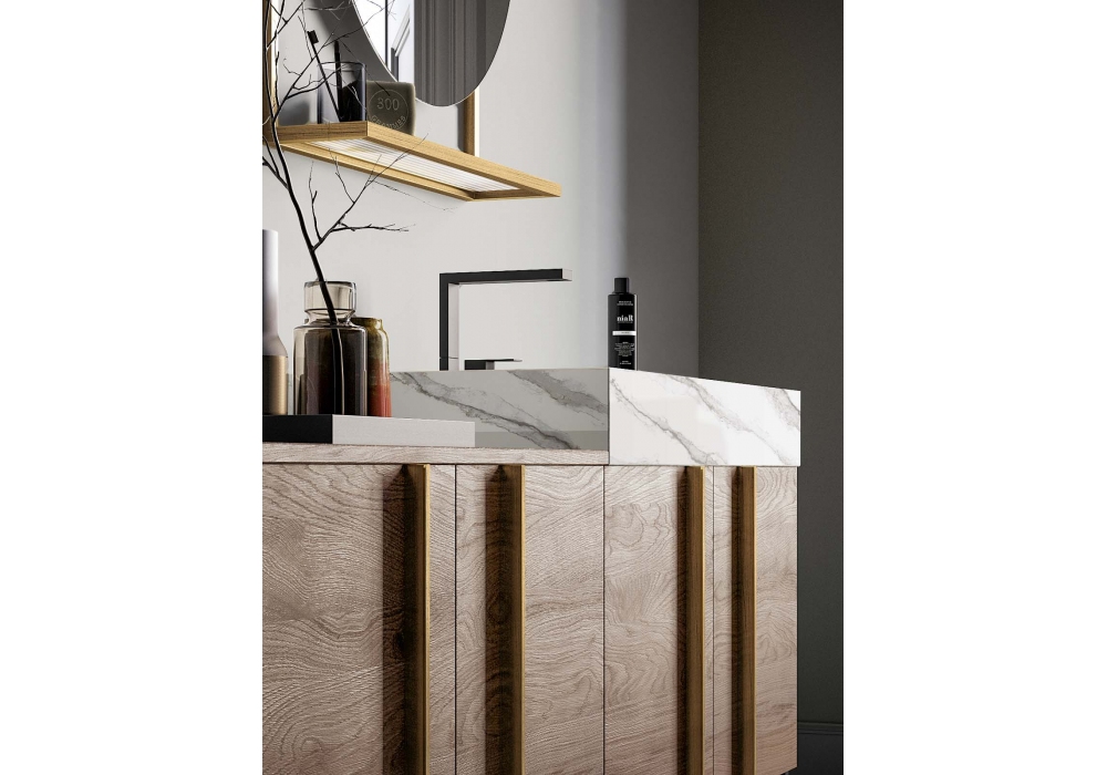 Sidéro von Imago für Birex entworfen, ist ein Badezimmersystem in Castoro-Eichenholz-Essenz, Oberseite mit integriertem Waschbecken aus weißem Larsen-Steinzeug, schwarzer Metallbasis und Griffen aus antikem Messing. Sidéro B-Spiegel mit Canneté-Glasablage und LED-Licht. Fronten mit Scharnieröffnung und vertikalem Aluminiumgriff.