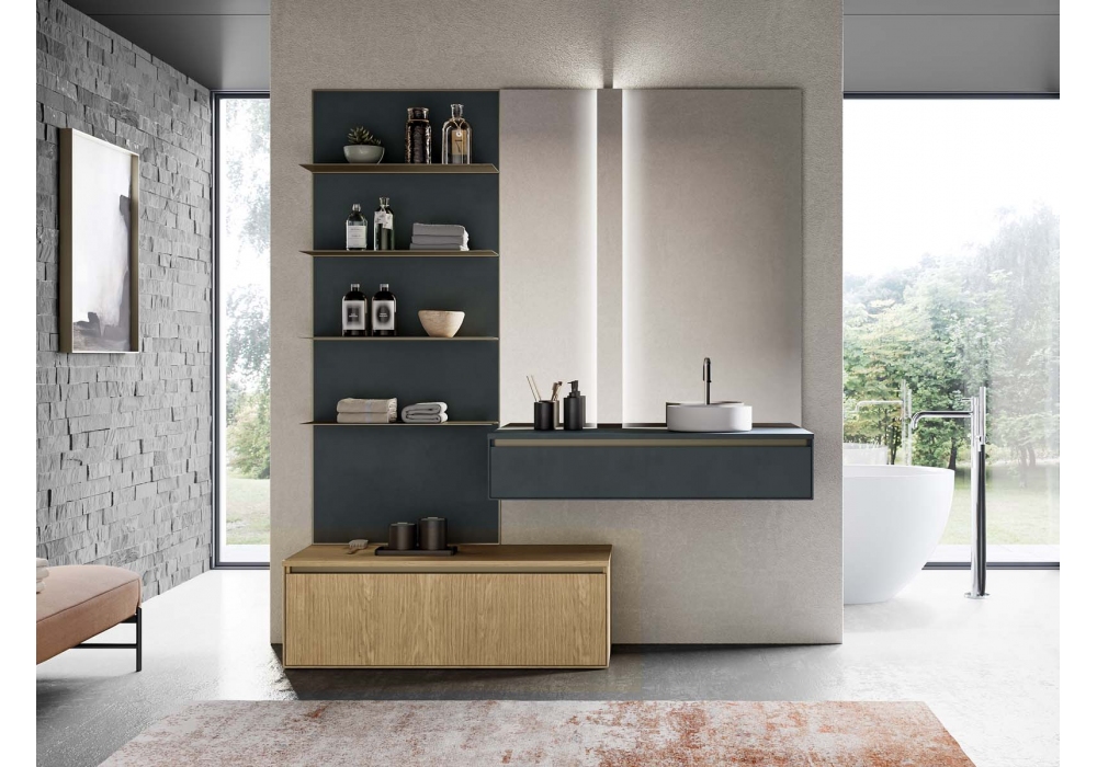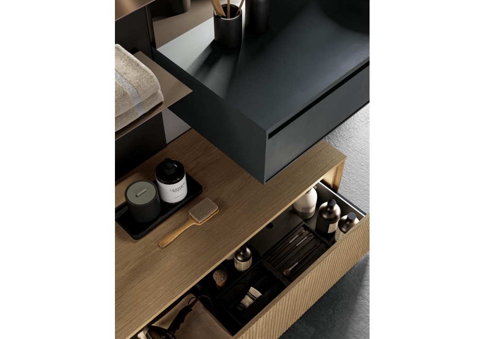 Traccia von Birex entworfen, ist ein Badezimmersystem in matt anthrazitgrau und Canneté sowie in natürlicher Eichenholz-Essenz, mattweißem Keramikwaschbecken, Rillen und Regalen aus Titanmetall. Schublade mit Innenausstattung und Seiten mit LED-Beleuchtung