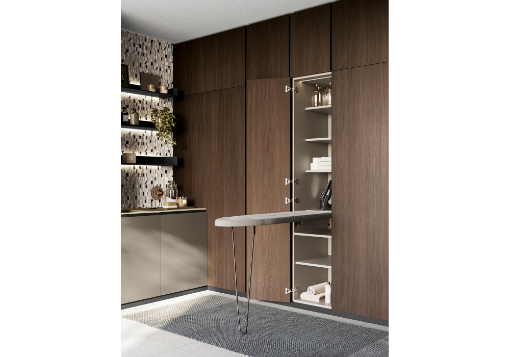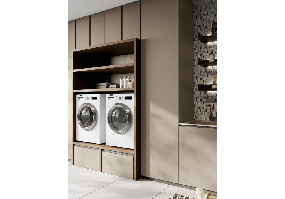 Idrobox von Birex entworfen, ist ein Wäscheschrank mit matt lackierten Seilsäulen mit offener Waschmaschinen- und Trocknereinheit aus strukturierter, wärmebehandelter Eiche und matt lackierten Seilkörben. Matt lackierte Seilunterschränke mit Platte und integriertem Waschbecken. Von hinten beleuchtete Metallregale. Ausgestattete Säulen und erhöhte Einheiten aus strukturierter, wärmebehandelter Eiche. Offenes Element aus strukturierter, wärmebehandelter Eiche mit matt lackierten Seilkörben auf Rädern.
