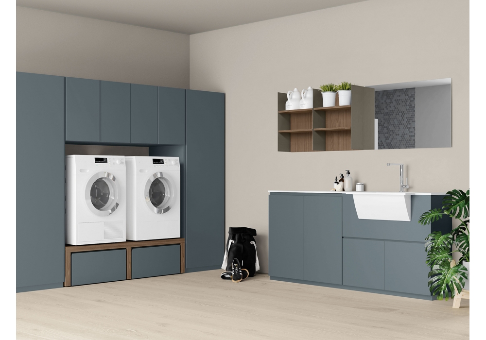 Idrobox von Birex entworfen, ist ein Wäscheschrank mit matt blaugrau lackierten Säulen und einer Sitzbank aus strukturiertem Alabama-Walnussholz. Matt blaugrau lackierte Sockel mit Mineralmarmorplatte und integriertem Waschbecken. Regale aus strukturiertem Alabama-Walnussholz und Seitenteile aus Titanmetall.