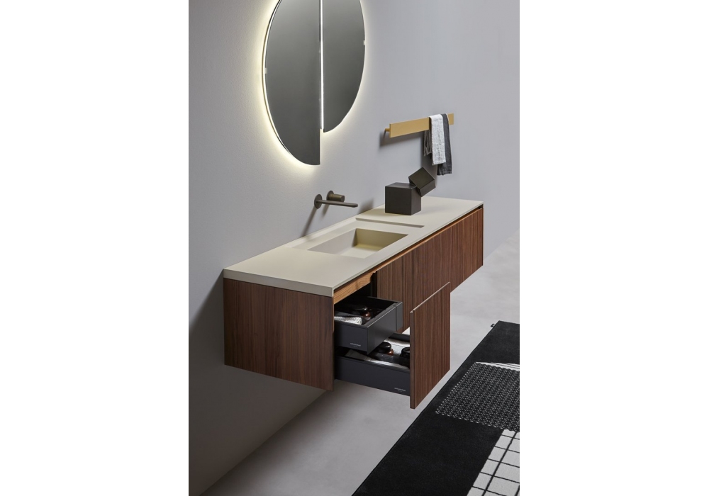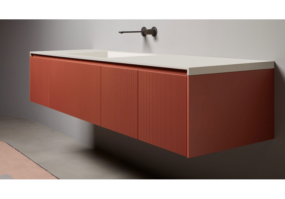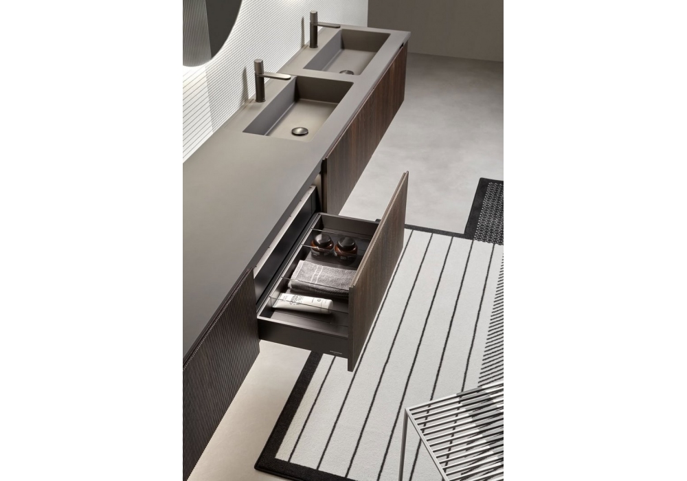 Binario von Nevio Tellatin für Antonio Lupi entworfen, ist eine Möbelkollektion mit minimalistischem Look und klaren Linien, die sich durch ein unverwechselbares grafisches Design auszeichnet, das Oberflächen in geometrische Dekorationen verwandelt. Die parallelen Fräsungen an Fronten und Seiten erzeugen einen leichten, raffinierten, dreidimensionalen Effekt. Binario ist in zwei Versionen erhältlich: Binario 03 Einschnitten und Binario 12 Einschnitten. Beide Versionen sind in Holz oder Lack erhältlich und passen perfekt zu den Platten der Ponte-Serie. Sie betonen die reinen, funktionalen Volumen und erzeugen ein Schattenspiel, das die Ästhetik des Möbels bereichert.