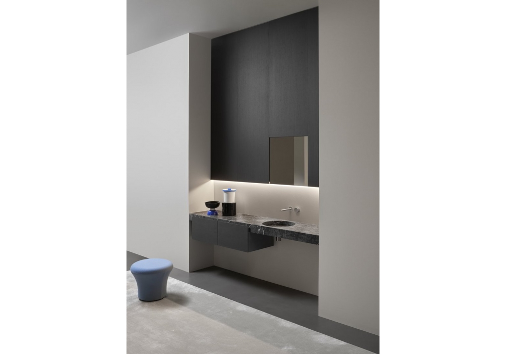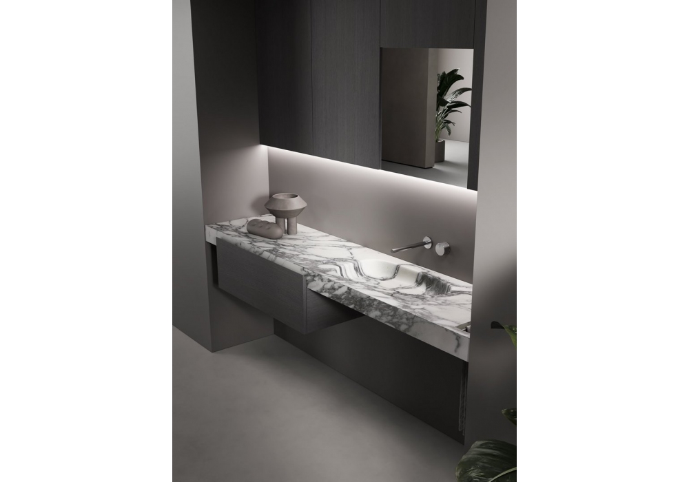 Fortepiano von Antonio Lupi entworfen, ist ein System aus massiven Marmor-Arbeitsplatten, das Materialstärke und formale Reinheit vereint. Dieses Projekt verwandelt Stein in eine nahtlose Oberfläche mit integrierten runden, ovalen, quadratischen oder rechteckigen Waschbecken, in denen das Wasser das Material selbst zu formen scheint. Fortepiano kann als Regal installiert oder in Antonio Lupi-Schränke integriert werden, wodurch ein raffinierter Dialog zwischen Texturen und Farben entsteht. Schlicht, kraftvoll, elegant: eine neue Art, Marmor als unangefochtenen Protagonisten des Badezimmers zu interpretieren.