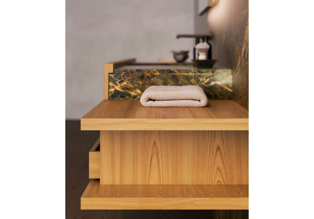 Framis von Vincent Van Duysen für Molteni&C entworfen, ist ein Badezimmersystem, das sich durch die Wärme von Bernstein-Eiche auszeichnet und einen reizvollen Kontrast zum Rain Forest Green Marmor der Arbeitsplatten und integrierten Waschbecken bildet. Der Unterschrank mit offenen Seitenelementen erzeugt ein dynamisches Zusammenspiel von Ebenen und Arbeitsflächen. Abgerundet wird das Ensemble durch die Ero-Badewanne aus Lavastein mit grüner Emaille-Innenausstattung, den hinterleuchteten Spiegel Eidon mit Zinnrahmen und die Flora-Armaturen – für einen eleganten und modernen Look.