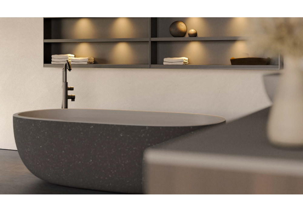 Hi-Line 6 von Molteni&C entworfen, ist ein Badezimmersystem mit einem schwebenden Unterschrank in Eukalyptusoptik, kombiniert mit einer dünnen Lavasteinplatte und dem Ero-Waschbecken mit Craquelé-Innenseite. Die Aluminiumrillen in Zinnoptik unterstreichen die klaren Linien des Designs. Die Ero-Badewanne greift die gleichen Oberflächen auf und sorgt so für ein harmonisches Gesamtbild. Der offene Orthal-Schrank in Zinnlack mit Aluminiumrahmen verleiht dem Bad Funktionalität und optische Leichtigkeit. Der runde, hinterleuchtete Spiegel und die Flora-Armaturen runden das elegante und stimmige Gesamtbild ab.