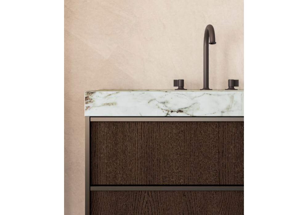 Ratio von Vincent Van Duysen für Molteni&C entworfen, ist ein Badezimmersystem mit wandhängendem Unterschrank in Kaffee-Eiche, das die charakteristische Geometrie des Ratio-Systems und ein Gitter in Zinnoptik aufweist, das die Türen aufwertet. Die 90 mm starke Arbeitsplatte aus Breccia Capraia Marmor integriert die Waschbecken und schafft eine elegante, strukturierte Oberfläche. Der runde, hinterleuchtete Spiegel und die Flora-Armaturen runden das Gesamtbild ab und verleihen ihm eine harmonische, raffinierte Optik.