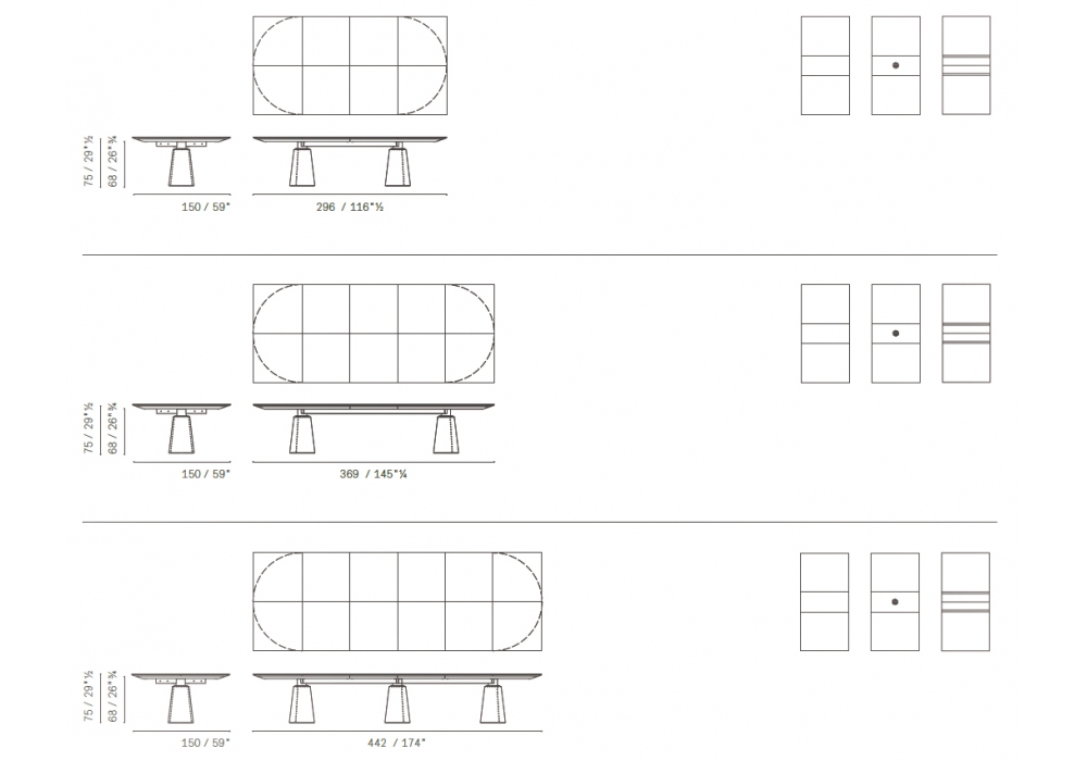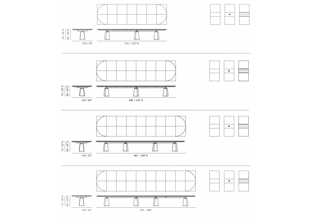 | Abmessungen | • 296 x 150 x H 75 cm; • 396 x 150 x H 75 cm; • 442 x 150 x H 75 cm; • 515 x 150 x H 75 cm; • 588 x 150 x H 75 cm; • 661 x 150 x H 75 cm; • 734 x 150 x H 75 cm |