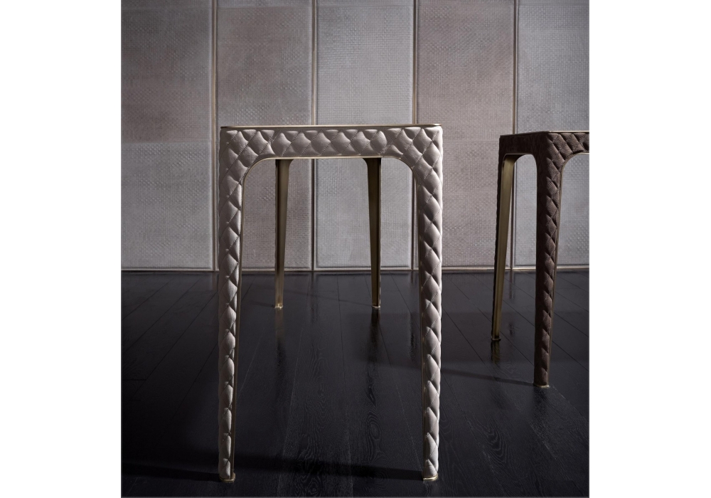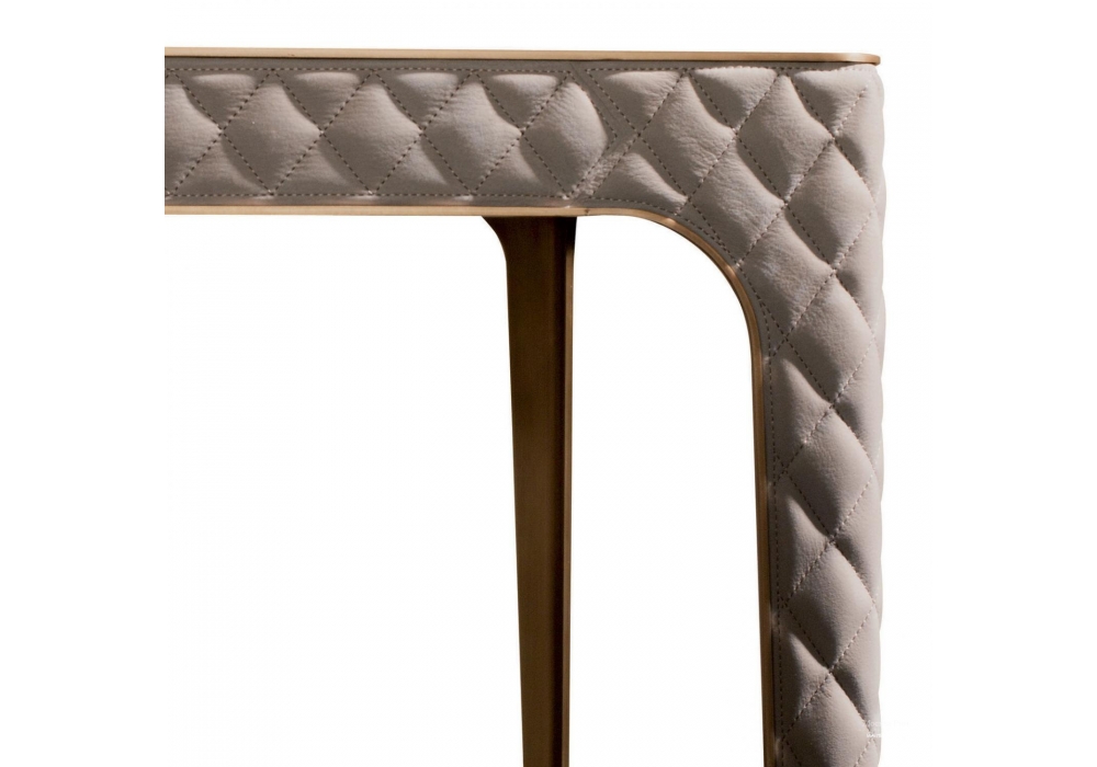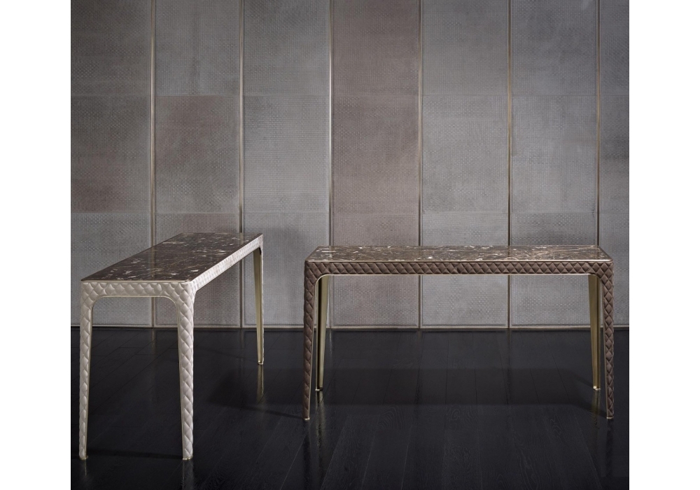 Lauren, entworfen von Rugiano, ist eine Kollektion von Konsolen mit einer Platte aus Leder, Glas oder Marmor und Beinen aus Leder mit Matelassé-Verarbeitung, die nur aus weichem, glattem Kat hergestellt wird. CD. Details in Stahl oder Bronze. Erhältlich in verschiedenen Größen.