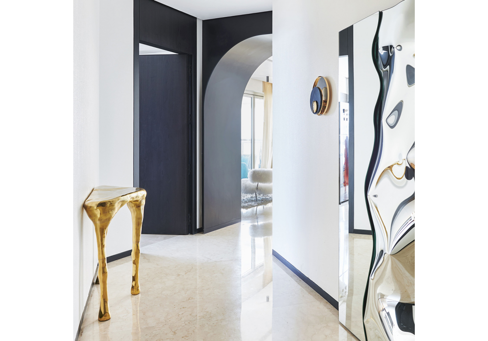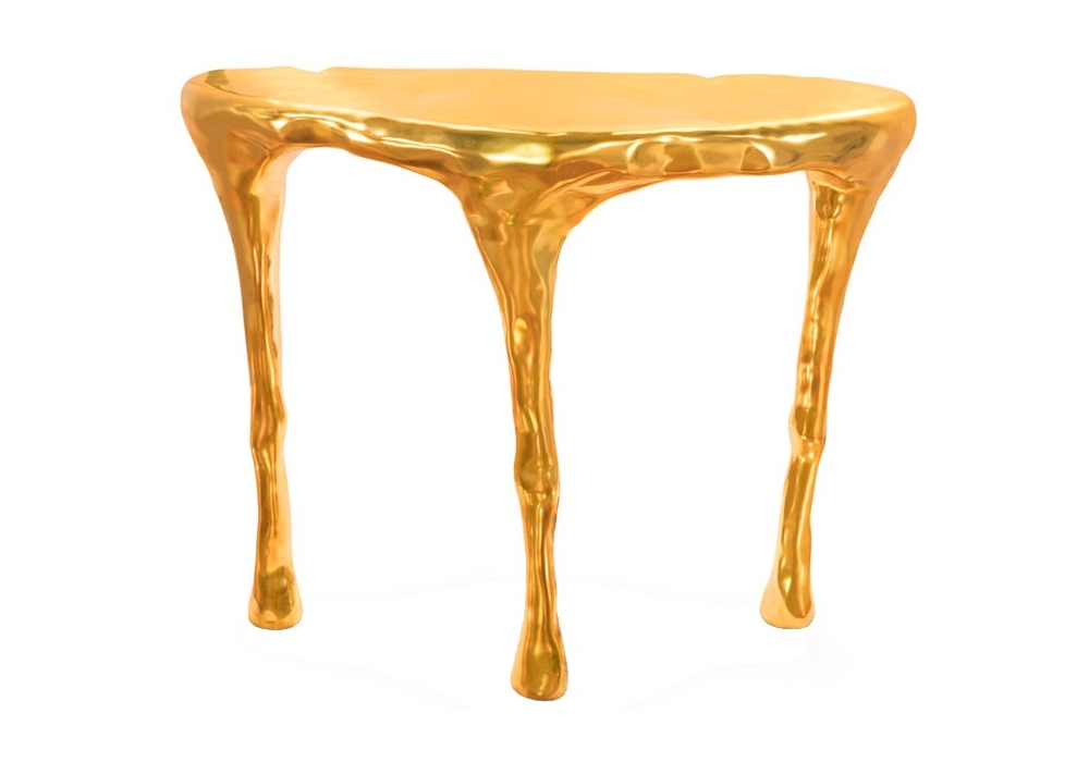 Bliss von Scarlet Splendor ist eine dreibeinige Konsole aus glänzend lackiertem Messing mit organischer Form und welliger Oberfläche.