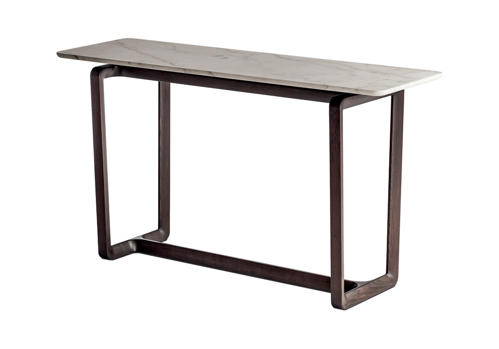 Fidelio von Roberto Lazzeroni für Poltrona Frau entoworfen, ist eine Konsole mit Sockel aus massivem Eschenholz mit einem charakteristischen dreieckigen Querschnitt. Platte verfügbar in Saddle Extra Leder oder Marmor.
