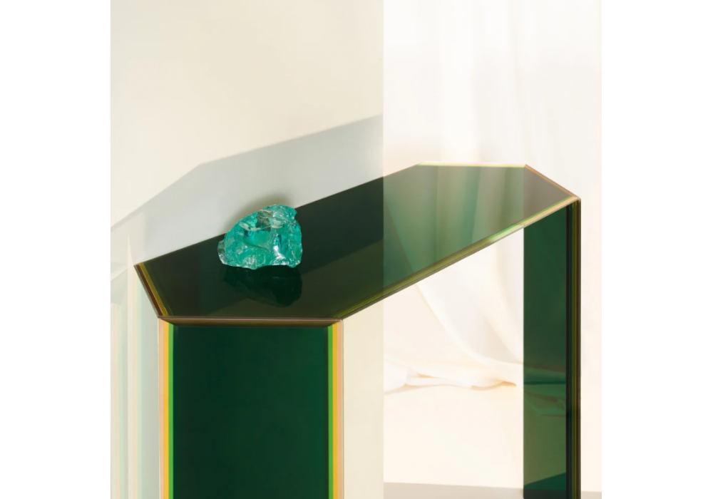 Bisel von Patricia Urquiola für Glas Italia entworfen, ist eine Konsole aus mehrschichtigem und mehrfarbigem Glas, das durch Laminieren von fünf Platten aus 5 mm extralight Glas mit jeweils einer andersfarbigen Folie hergestellt wird.