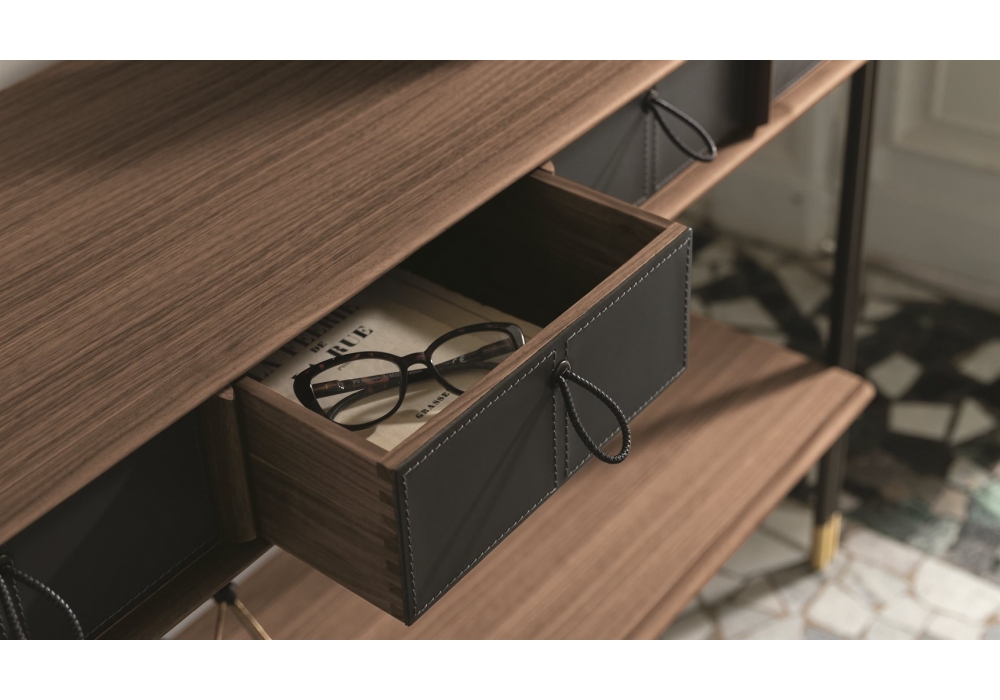 Bayus 8, von G. & O. Buratti für Porada entworfen, ist eine Konsole mit Gestell aus Canaletta Nussbaum . Metallfuß mit Bronzoro-Finish und Endfüßen aus gebürstetem Messing. Vorgeschlagen mit vier Fächern mit der Möglichkeit, vier Schubladen einzufügen. Nur in einer Dimension erhältlich.