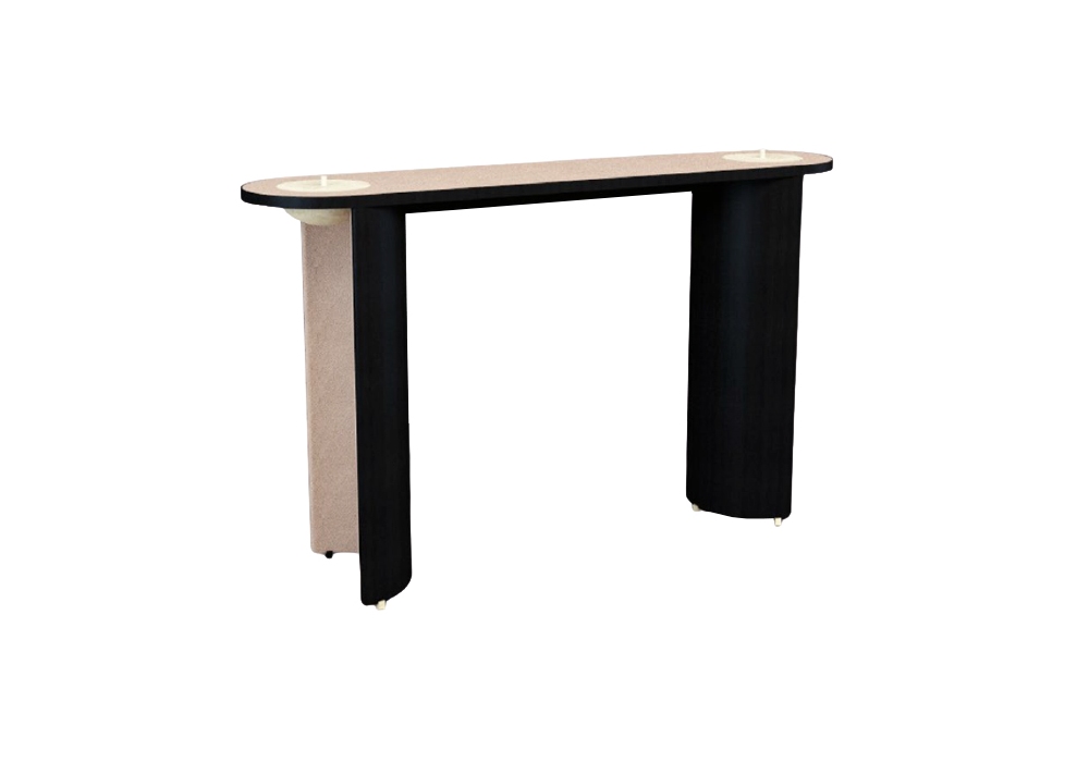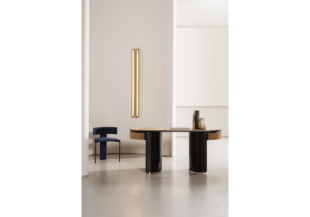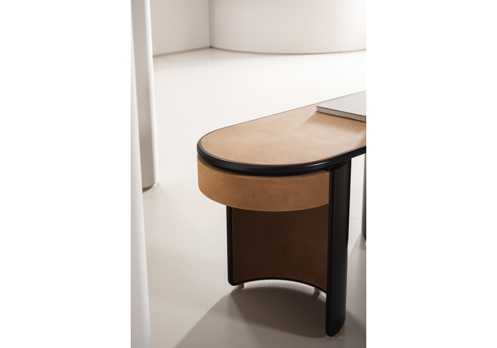 Parsec von Pietro Russo für Baxter entworfen, ist ein Konsole mit einem Oberteil aus mattschwarz lackiertem MDF und einem mit Leder überzogenen Mitteloberteil. Beine aus Pappel, außen mattschwarz lackiert, Innen mit Leder bezogen. Füße und Details aus satiniertem Messing.