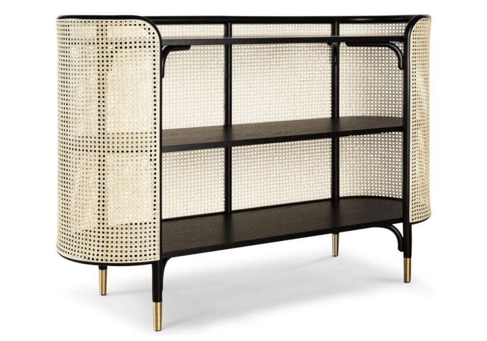 Mos von GamFratesi für Gebrüder Thonet Vienna entworfen, ist eine Konsole mit Buchenbugholzgestell und eingesetztem Wiener Geflecht. Regale aus offenporigem, lackiertem Eschefurnier. Messing-Füßen.