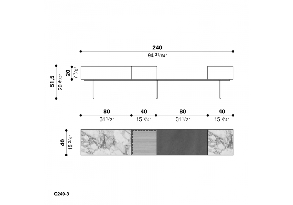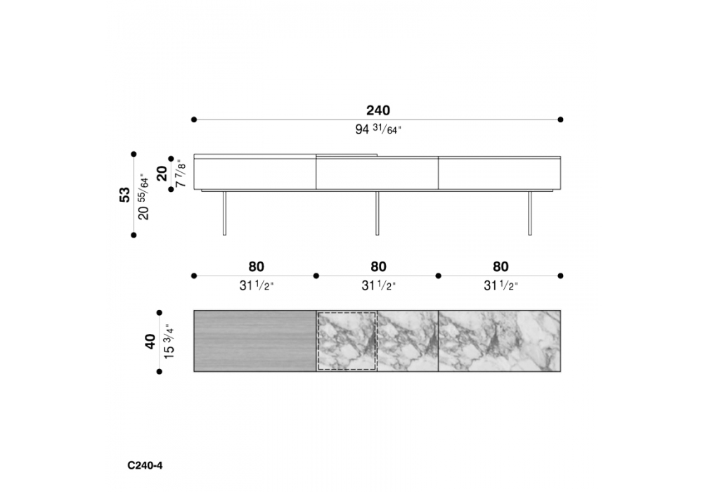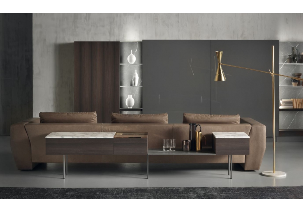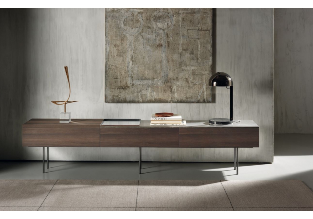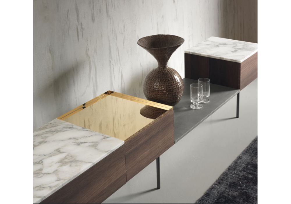 Moodboard Konsole entworfen von Massimo Mariani für Acerbis ist eine niedrige modulare Konsole in matten dunkelgrau Füße lackierten, oben in Holz oder Marmor und verfügbare Serviertablett aus polierten Stahl oder Messing Oberflächen. Die Struktur ist im gleichen Finish wie die gewählte Holzplatte.