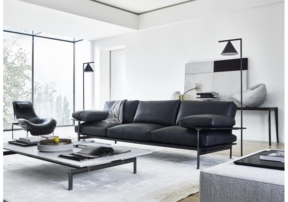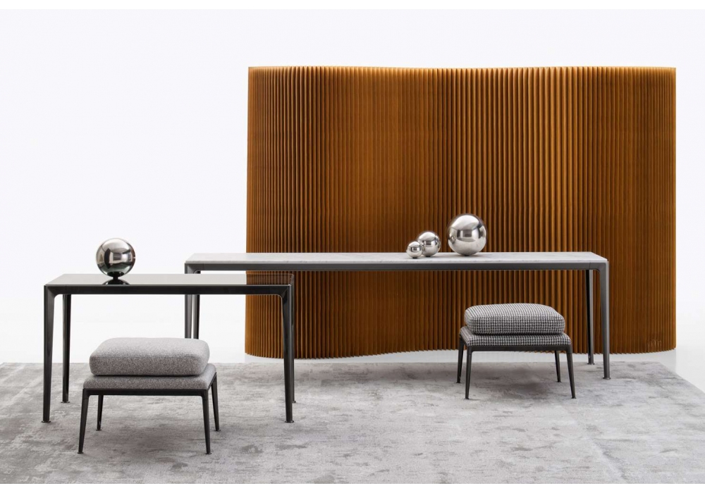 Mirto Indoor von Antonio Citterio für B&B Italia entworfen, ist eine Konsolenkollektion mit Gestell aus Aludruckguss und fließgepresstes Aluminium schwarz verchromt lackiert oder hartzinnfarben lackiert. Platte erhältlich in glänzendem Frisé-Eukalyptus, Eichenfurnier, MDF-Holzfaserplatte, Glas oder Marmor. In drei Dimensionen erhältlich.