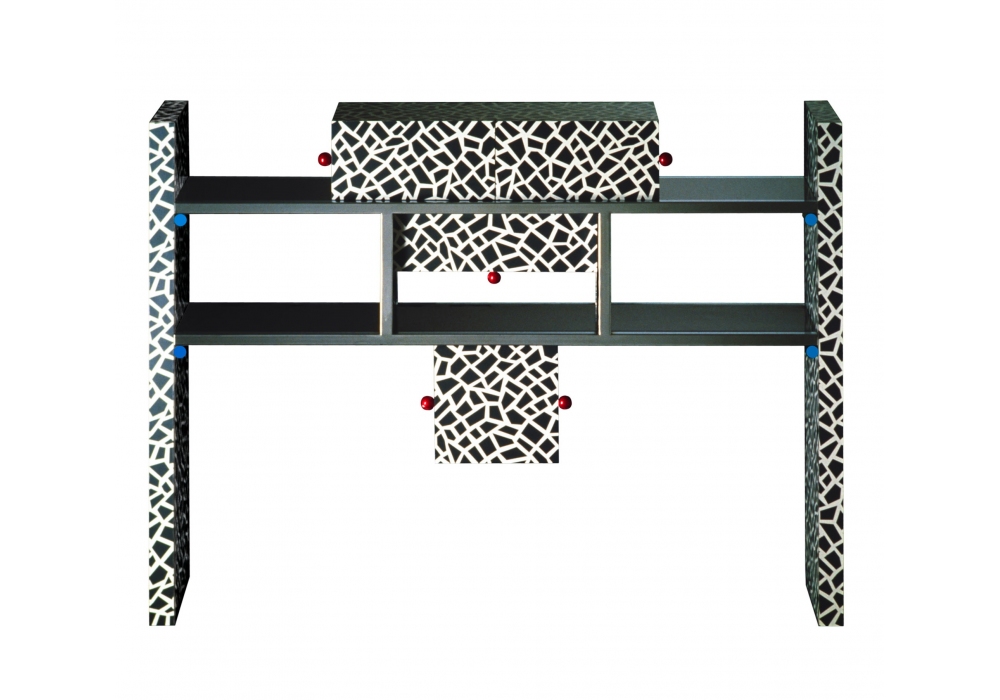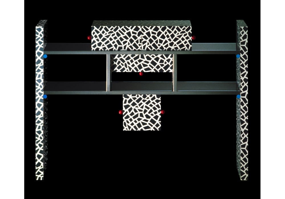 Lodge von Martine Bedin für Memphis Milano entworfen, ist eine Konsole mit vier Holzschubladen, die mit Kunststofflaminat überzogen sind.
