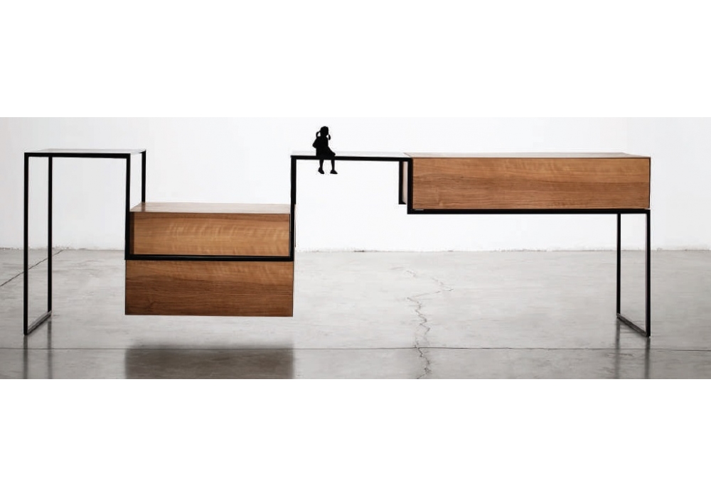 Zefir von Giacomo Moor für Memphis Milano entworfen, ist eine Konsole mit einer eisernen Tragstruktur, die zwei kastenartige Volumen aus Nussbaum trägt und kreuzt. Ein Schubladenpaar ermöglicht das Öffnen des linken Volumens, das auch als Sitzgelegenheit genutzt werden kann; eine einzelne Schublade öffnet die rechte. Limitierte Auflage von 25 Stück.