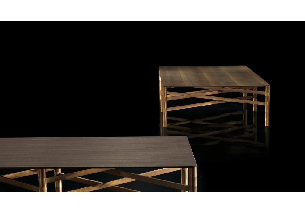 Network von Massimo Castagna für Henge entworfen, ist eine Konsole bestehend aus einer Messingstruktur und einer Platte aus Massivholz oder Stein.