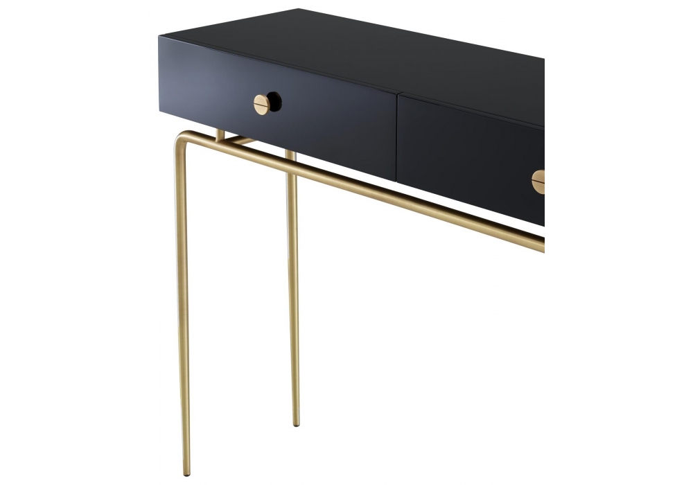 Débourgeoisée von Desjeux Delaye für Ligne Roset entworfen, ist eine Konsole mit Untergestell und Griff aus matt gebürstetem messingbeschichtetem Stahl. Schubladen aus schwarz glänzend lackiertem MDF auf unsichtbaren Führungen, ausgestattet mit kontrollierter Schließung.