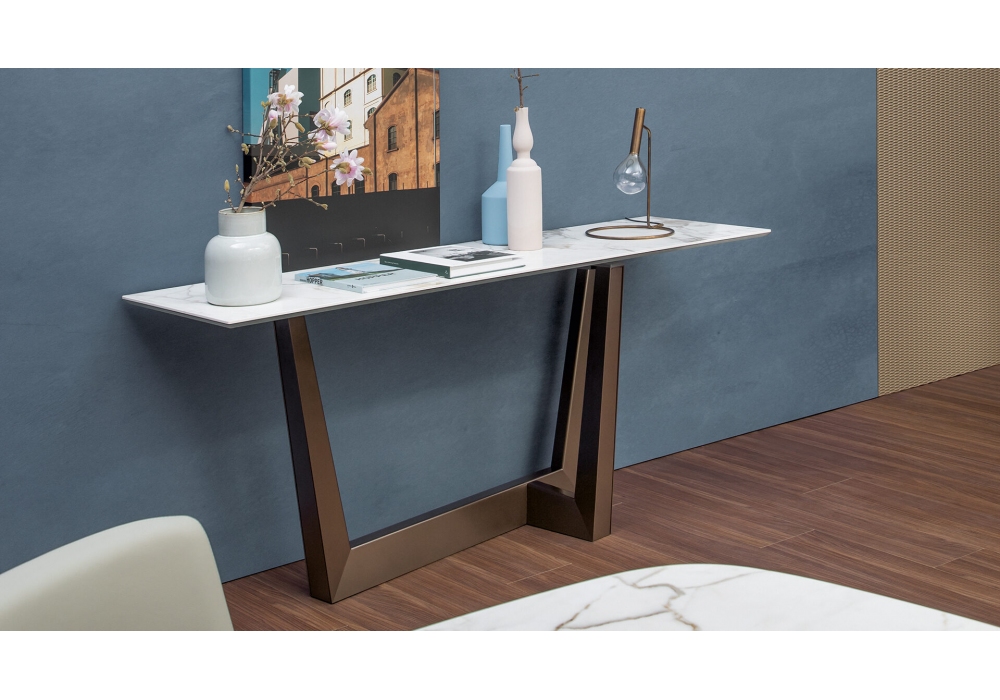 Art von Gino Carollo für Bonaldo entworfen, ist eine Konsole mit rechteckiger oder tonnenförmiger Platte, in verschiedenen Größen. Die Basis ist aus lackiertem Metall in verschiedenen Ausführungen, die Platte ist in verschiedenen Materialien und Farben hergestellt.