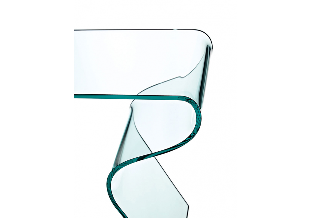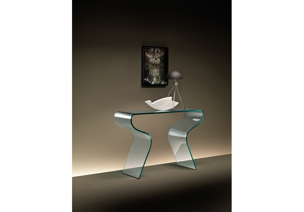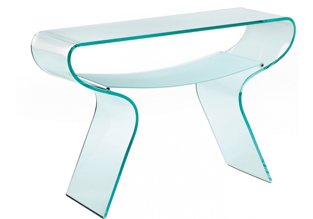 Charlotte von Prospero Rasulo für Fiam entworfen, ist eine Konsole aus gebogenem Glas. Auch in der Version mit gebogener Ablage aus geätztem Glas erhältlich.