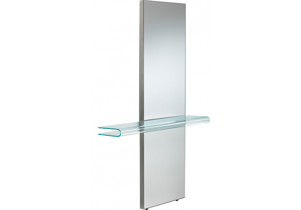Let Me See von Rodolfo Dordoni für Fiam entworfen, ist eine Konsole aus gebogenem Glas und einem Regal, das rechts oder links positioniert werden kann. Rahmen aus satiniertem Edelstahl.