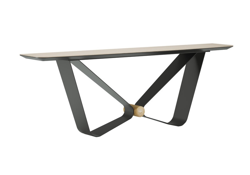 Sharon von Gualter Torres für Gual Design entworfen, ist eine Konsole mit schwarz lackierter Eisenstruktur und schwarz lackierter Platte, die mit furniertem Holz in verschiedenen Ausführungen bedeckt ist.