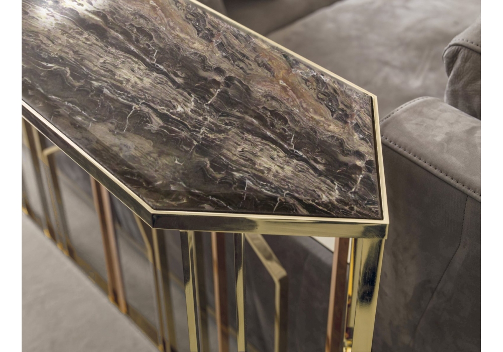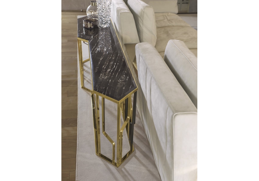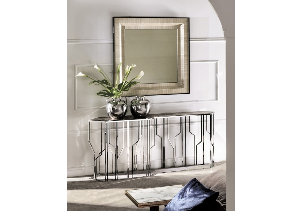 Ginza von Alessandro La Spada für Longhi entworfen, ist eine Konsole mit Struktur aus glänzendem oder mattem Metall und Platte aus Marmor, Spiegel oder Leder bezogen. Verfügbar in verschiedenen Größen.