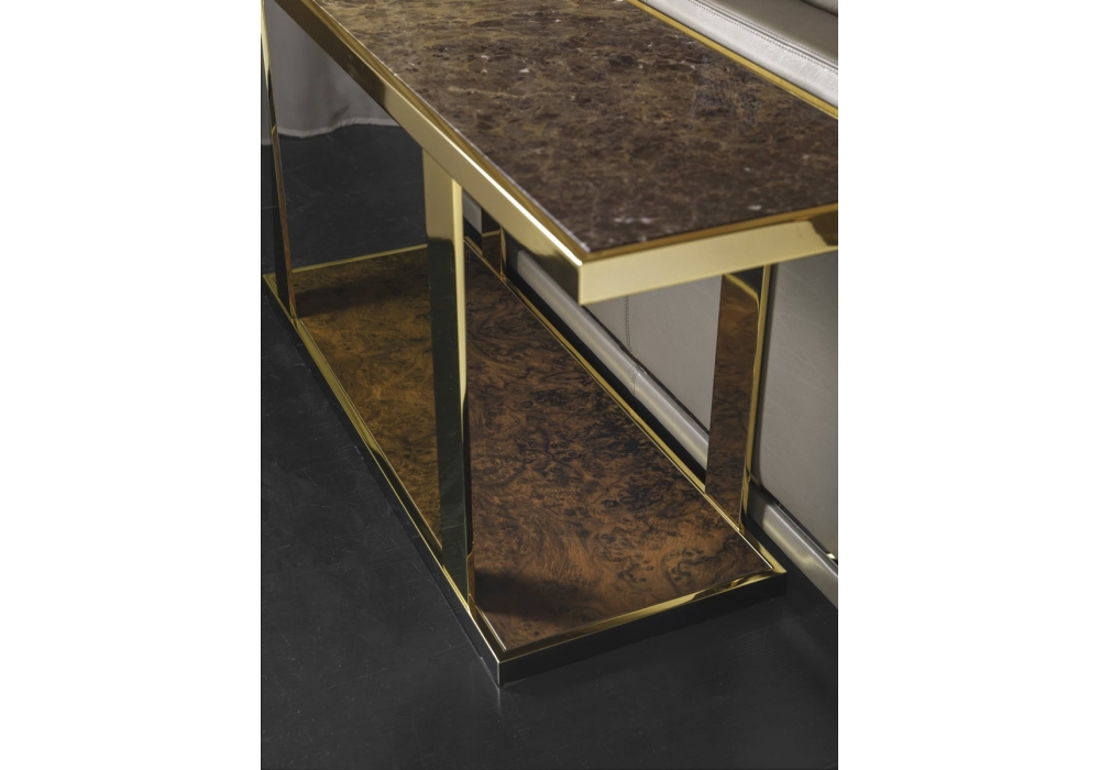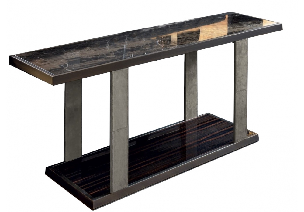 Layer von Giuseppe Viganò für Longhi entworfen, ist eine Konsole mit Metallstruktur und Marmorplatte. Untere Platte aus Holz oder mit Leder bezogen mit Säulen aus Leder oder auf Anfrage in der gleichen Farbe wie die Struktur.