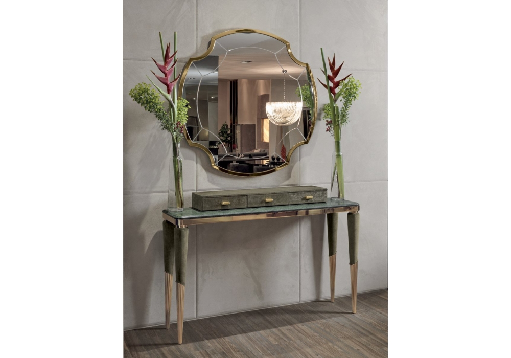 Odette von Giuseppe Iasparra für Longhi entworfen, ist eine Konsole mit 4 konischen Beinen, die mit Leder und Metallteilen in glänzender oder matter Ausführung bezogen sind. Spiegel- oder Marmorplatte. Mit Leder bezogene Kommode mit geriffelten Metallgriffen, die zur Beinspitze passen.