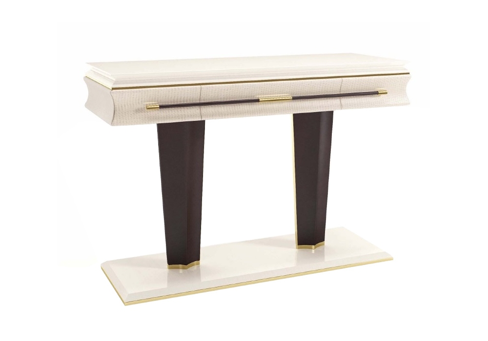 Noir von Andrea Bonini für Turri entworfen, ist eine Konsole mit Struktur aus MDF und Massivholz, Basis aus handverziertem glänzendem Polyester-Finish und Platte aus Holz oder Marmor. Es gibt eine Schublade mit Innenfutter aus Mikrofaser und Metallgriffen mit Lederapplikationen.