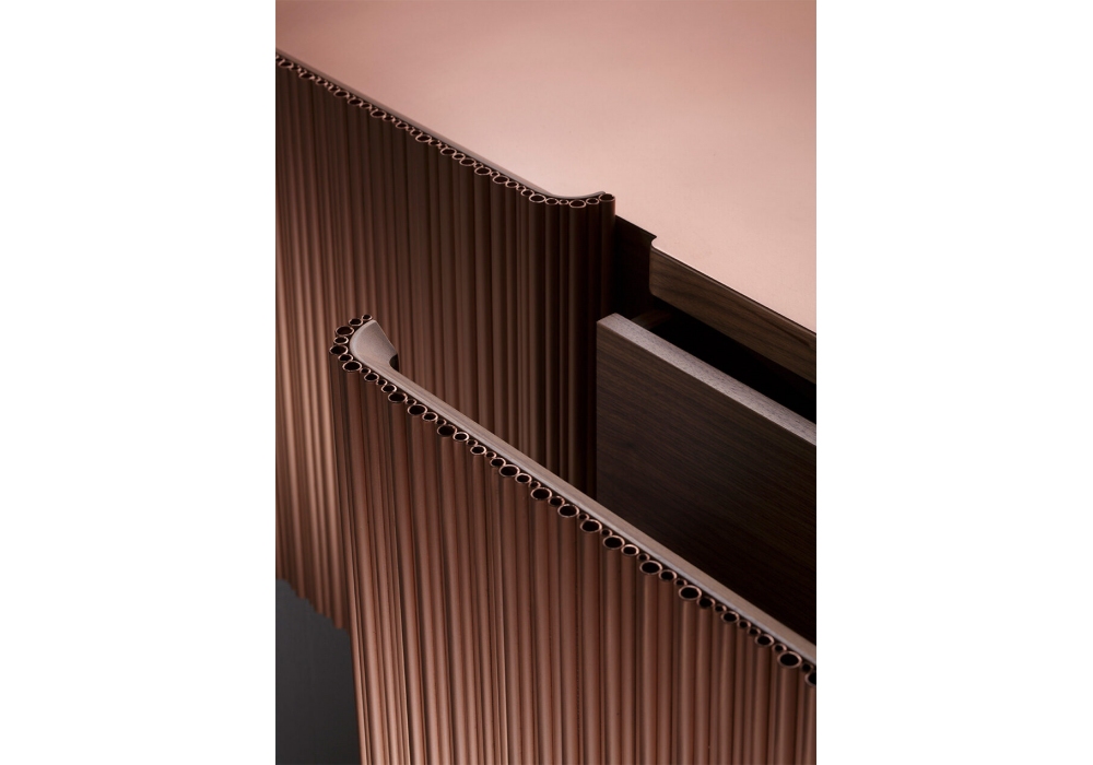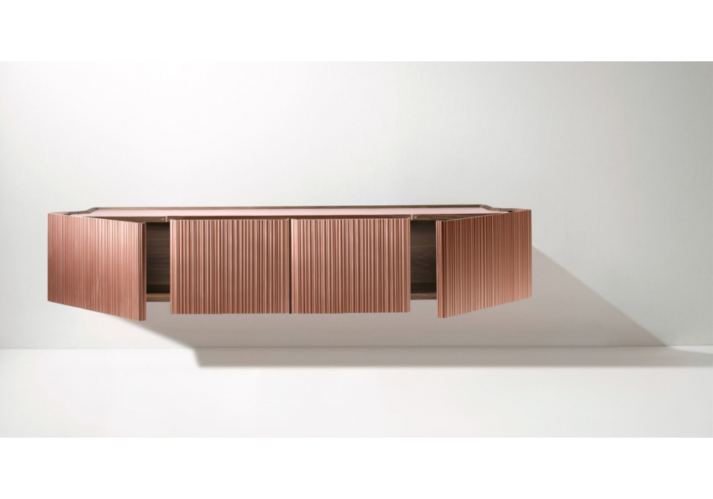 Canneto von Adriano Design für DeCastelli entworfen, ist eine Konsole aus Metall mit zwei Schubladen und zwei Seitentüren. Innenstruktur aus Nussbaumholz Canaletto. Erhältlich in verschiedenen Ausführungen und in der Boden- oder Hängeversion.