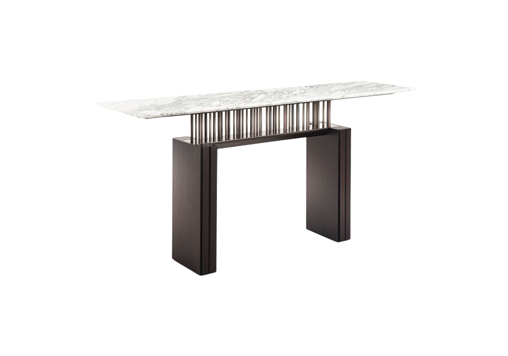 G-Code, entworfen von Dante O. Benini und Luca Gonzo für Giorgetti, ist eine Konsole mit Struktur aus Canaletto-Walnuss, in verschiedenen Ausführungen. Die Platte hat um 30° abgeschrägte Kanten und kann aus Marmor oder Canaletto-Walnuss in verschiedenen Farben hergestellt werden. Sie ist mit einer titanlackierten MDF-Unterplatte verbunden, die beide von einer Metallstruktur getragen werden, die aus 49 Zylindern in drei verschiedenen Größen und Ausführungen besteht ( gebürsteter Champagner, matte Bronze, Zinn). Verstellbare Füße mit verstecktem Mechanismus.