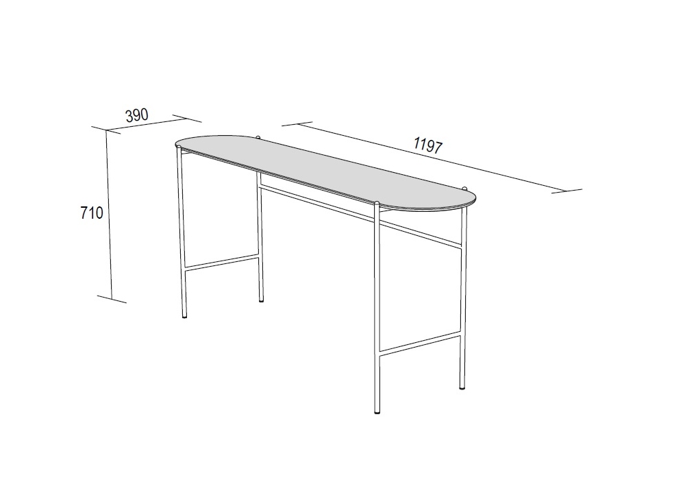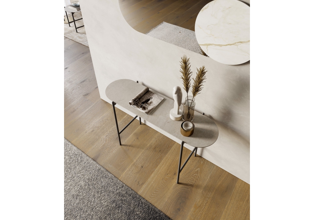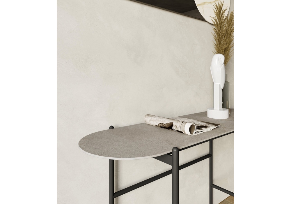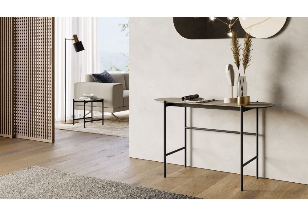 Supernova von Signorotto+Partners für Dall'Agnese entworfen, ist eine Konsole mit Metallstruktur und einer Platte aus Holz oder Steingut, gepaart mit einer mattschwarz lackierten Holzplatte.