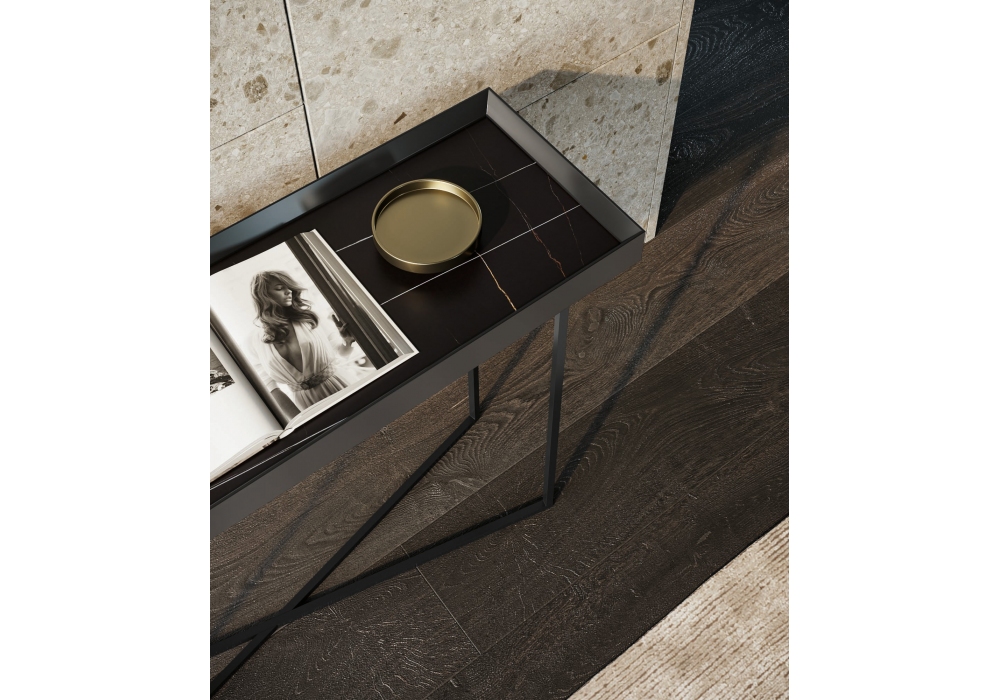 Slash von Signorotto+Partners für Dall'Agnese entworfen, ist eine Konsole mit Metallstruktur und -platte mit umlaufendem Holzrahmen und Platte verfügbar aus Holz oder Steingut.