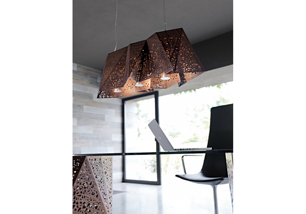 Plywood Chandelier von Steven Holl für Casamania & Horm entworfen, ist ein Kronleuchter, der aus einem Lampenschirm besteht, der aus einem von Horm entwickelten und patentierten Material besteht, das aus einem Sandwich aus Holz (Nussbaum Canaletto) und 2,2 mm dickem Stoff besteht, der dank oberflächlicher Einschnitte mit dem Laser hergestellt wird Beim Schneiden ist es wie Origami gefaltet. Befestigung an der Decke mittels Stahlplatte und verstellbaren Stahlaufhängungsdrähten.