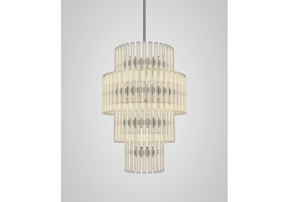 Aurora Tiered, hergestellt und signiert von Lee Broom, ist ein runder Kronleuchter mit einer tragenden Struktur aus verchromtem Stahl, die mit verschiedenen röhrenförmigen Elementen aus geblasenem Glas geschmückt ist. Die gewählte Lichtquelle ist vom dimmbaren LED-Typ. Aurora Tiered kann angepasst werden, um mehrstufige Kronleuchter zu erstellen, indem sie miteinander verbunden werden.